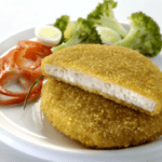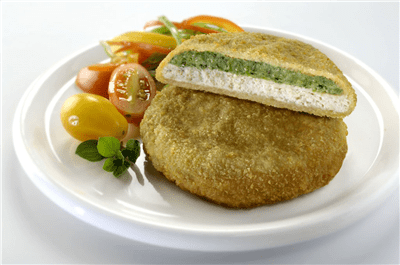 Características: Medallón de pollo con espinaca. Producto de rápida preparación, pre frito y rebozado.
