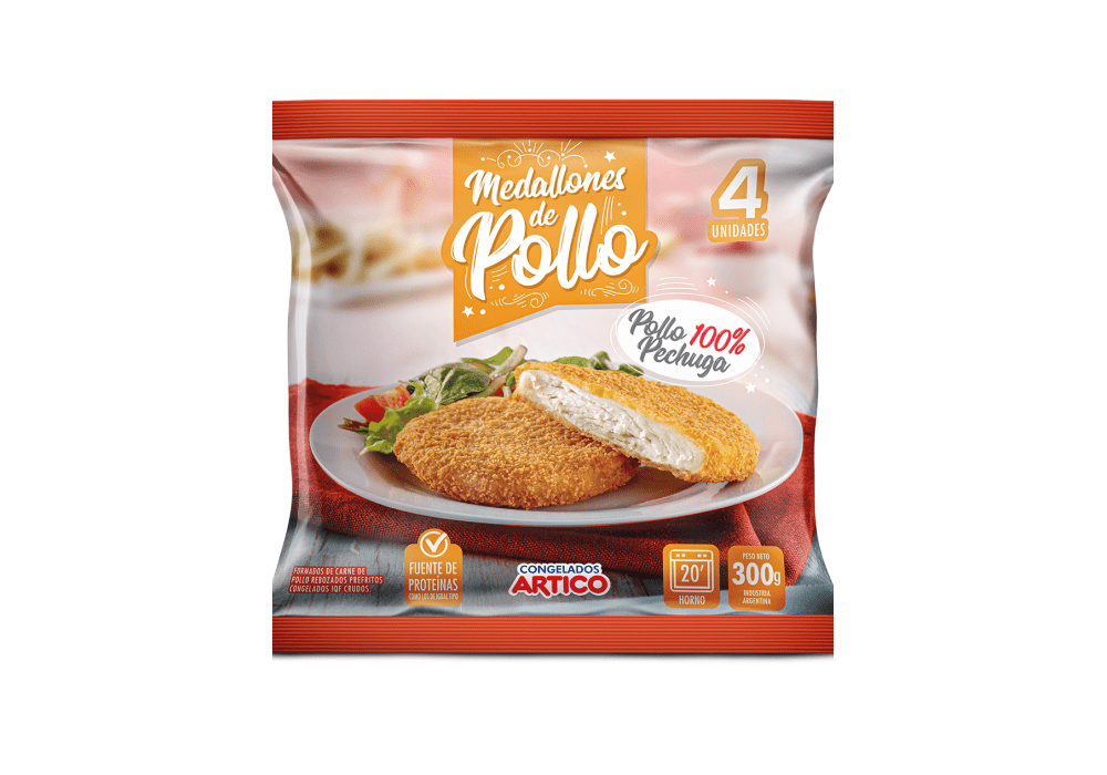 Características: Medallón de pollo. Producto de rápida preparación, pre frito y rebozado.