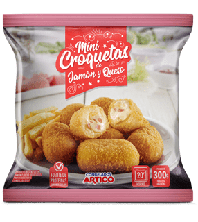 Características: Croqueta con jamón y queso. Producto prefrito. Contiene derivados de trigo y leche, no apto para celíacos. Peso aproximado por unidad: 25 g