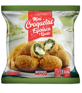 Características: Croqueta de espinaca y queso. Producto prefrito. Contiene derivados de trigo y leche, no apto para celíacos. Peso aproximado por unidad: 25 g