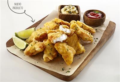 Características: Miniatura de merluza a la romana. Producto de rápida preparación, pre frito y rebozado.