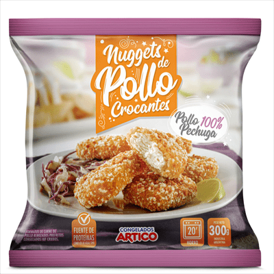 Características: Nuggets de pollo con rebozado crocante. Producto de rápida preparación pre frito.