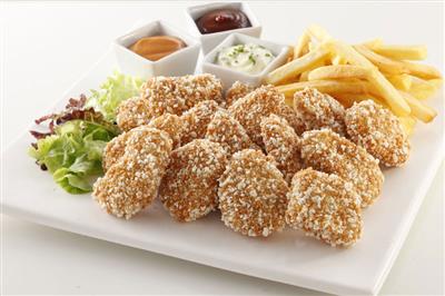 Características: Nuggets de pollo con rebozado crocante. Producto de rápida preparación pre frito.