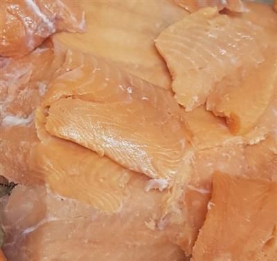 Descripción del producto: Block de recortes de salmón. Producto elaborado a partir de porciones de 50 gr aprox.