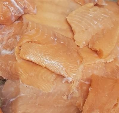 Descripción del producto: Block de recortes de salmón. Producto elaborado a partir de porciones de 50 gr aprox.